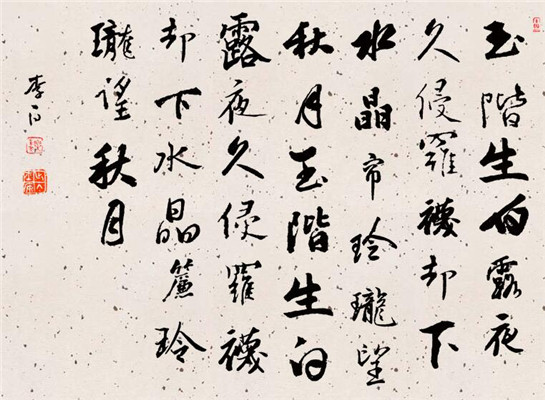 这首诗设色淡雅,造境高妙,从玉阶、白露、罗袜、到水晶帘幕、玲珑秋月,一色的冰清玉洁、超凡脱俗。在这样的场景中,女主人公始而伫立玉阶,继而露侵罗袜,又继而入室下帘、隔帘望月。这一切,究竟是为了什么?究竟为什么,女主人公不便明言,作者也秘而不宣,全让读者去驰骋想象。言有尽而意无穷的妙处,从这类诗中可以领悟??。