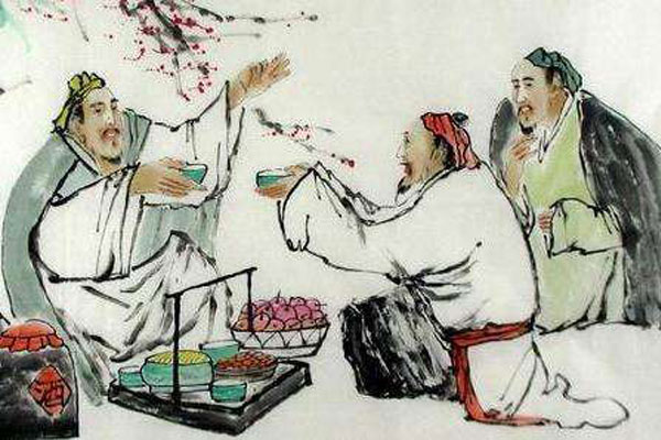 两人对饮着不知不觉中天色已经暗了,落花沾满了我的衣服。